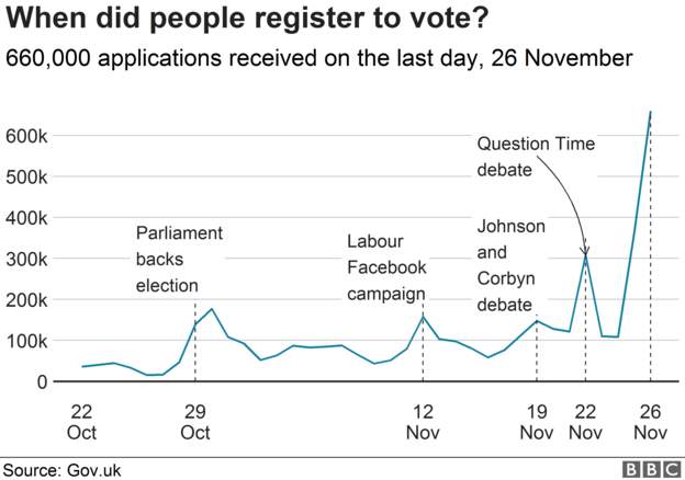 For an update on the BBC's election liveblog on November 27 2019, Dan Wainwright looked at peaks in voter registration leading up to the deadline the previous night.
