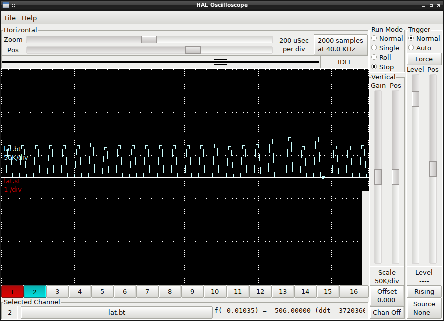 Here we see the "last base thread time" (hal signal name lat.bt) in halscope, so each successive value of it is captured. You can see that it is multimodal with many instances near 0 and many instances near 75000 but some going higher.