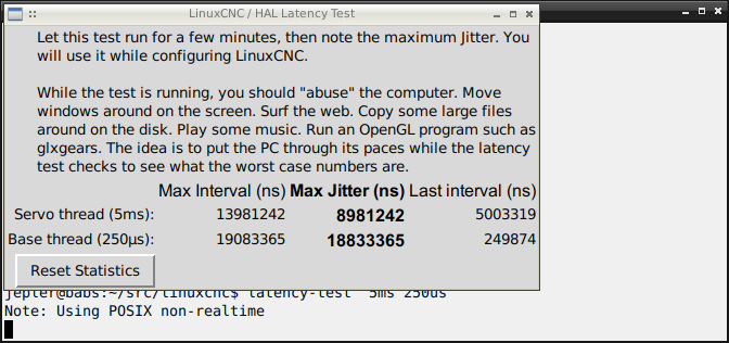 You can also see that with e.g., latency-test 5ms 250us of course we are still not meeting realtime deadlines but at least the base thread last interval is often close to the nominal requested value, because apparently 250us is within the range of a small sleep on my system. (this is actually on a -rt kernel but I have not "sudo make setuid" and linuxcnc / hal report "Note: Using POSIX non-realtime")