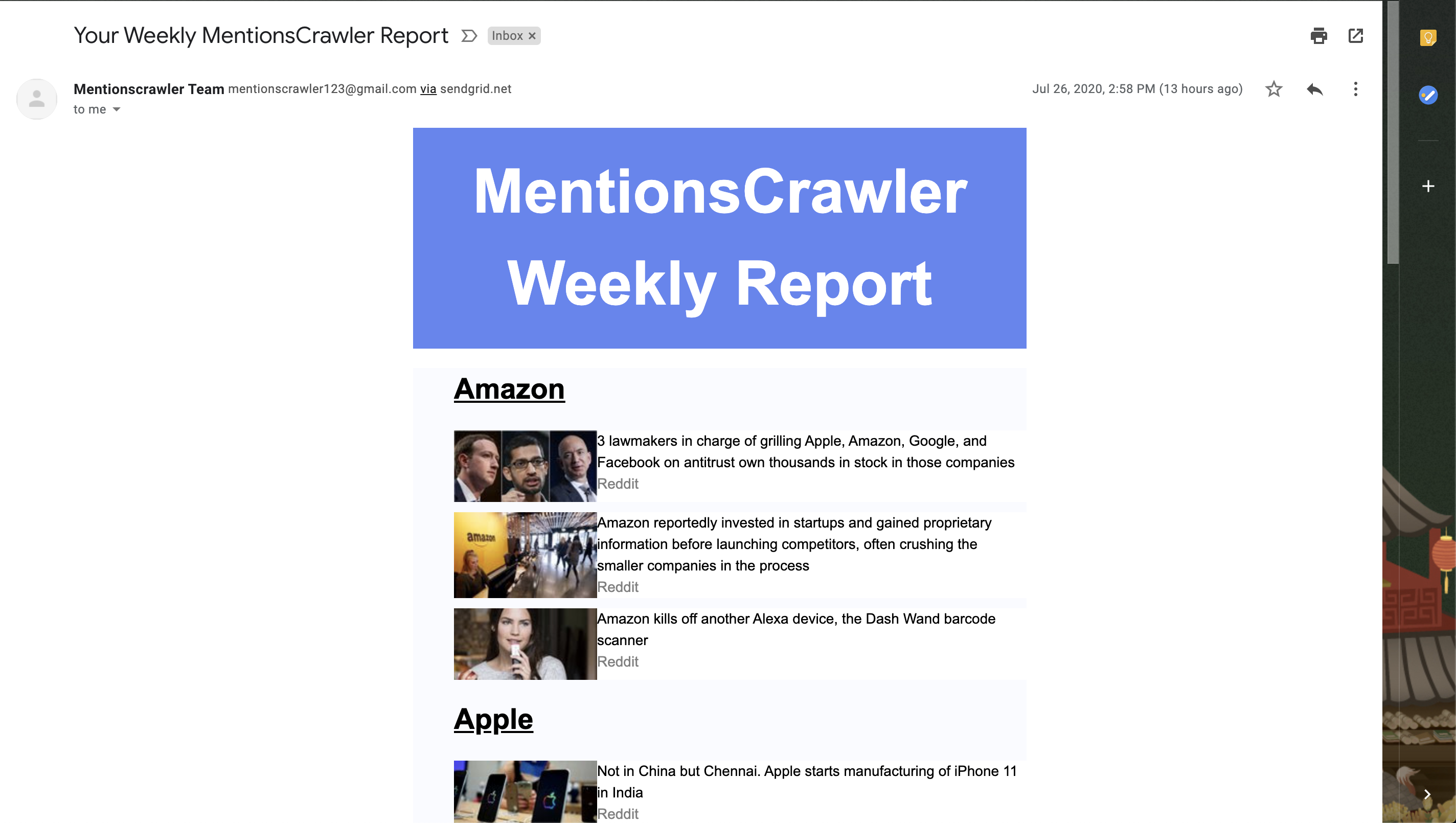 We also have a feature that will send you the latest updates on your company through a weekly newsletter. This newsletter will gather the top ten most popular stories through all our platforms and display it in your email, as seen here: