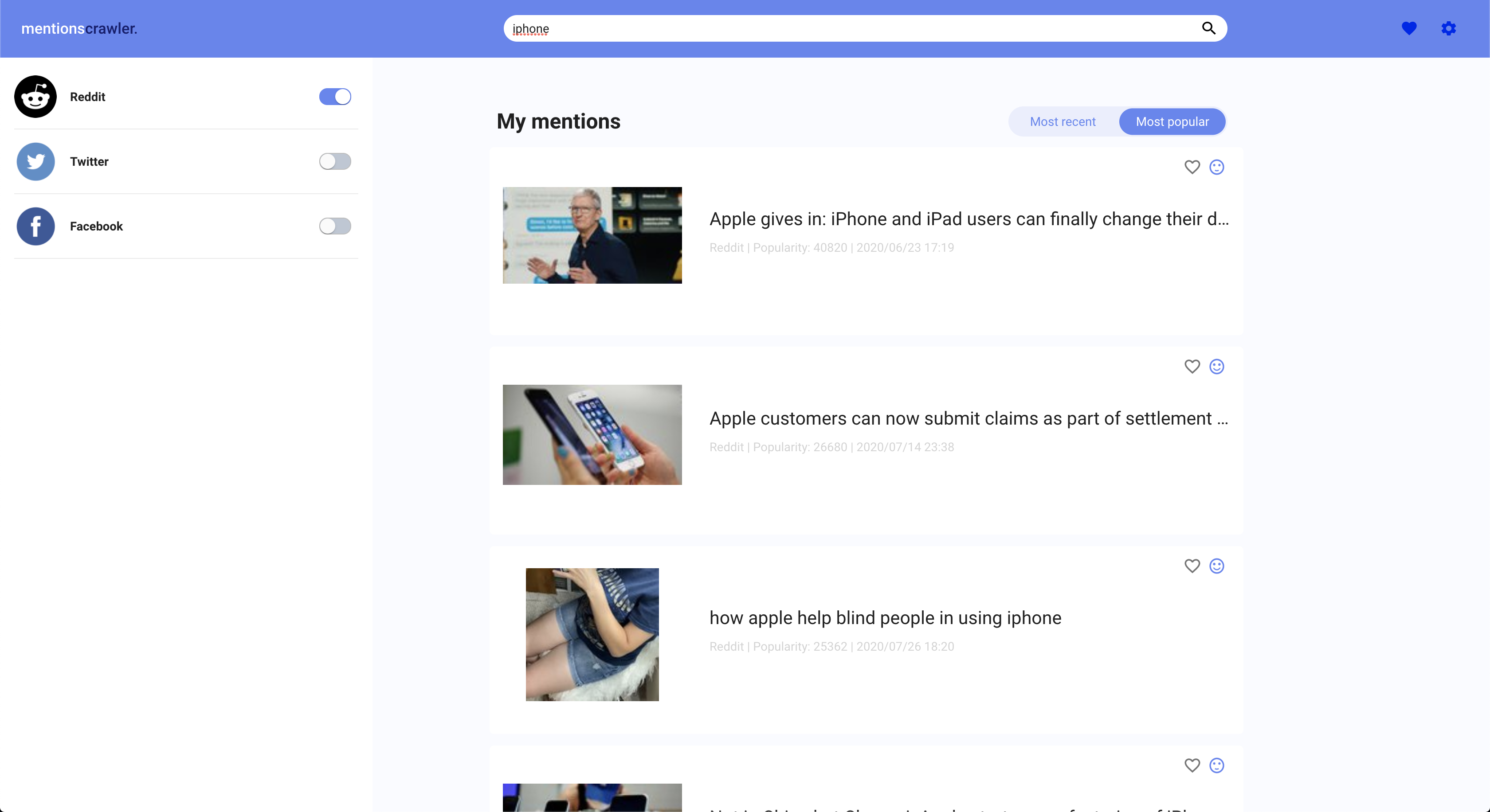 From here, they can filter by which social media sites they want news from, by how recent or most popular the post is, and by keyword, if they only want news regarding a particular item/event. Each mention can also be favorited for reference and will be saved in a "Liked Mentions" component.